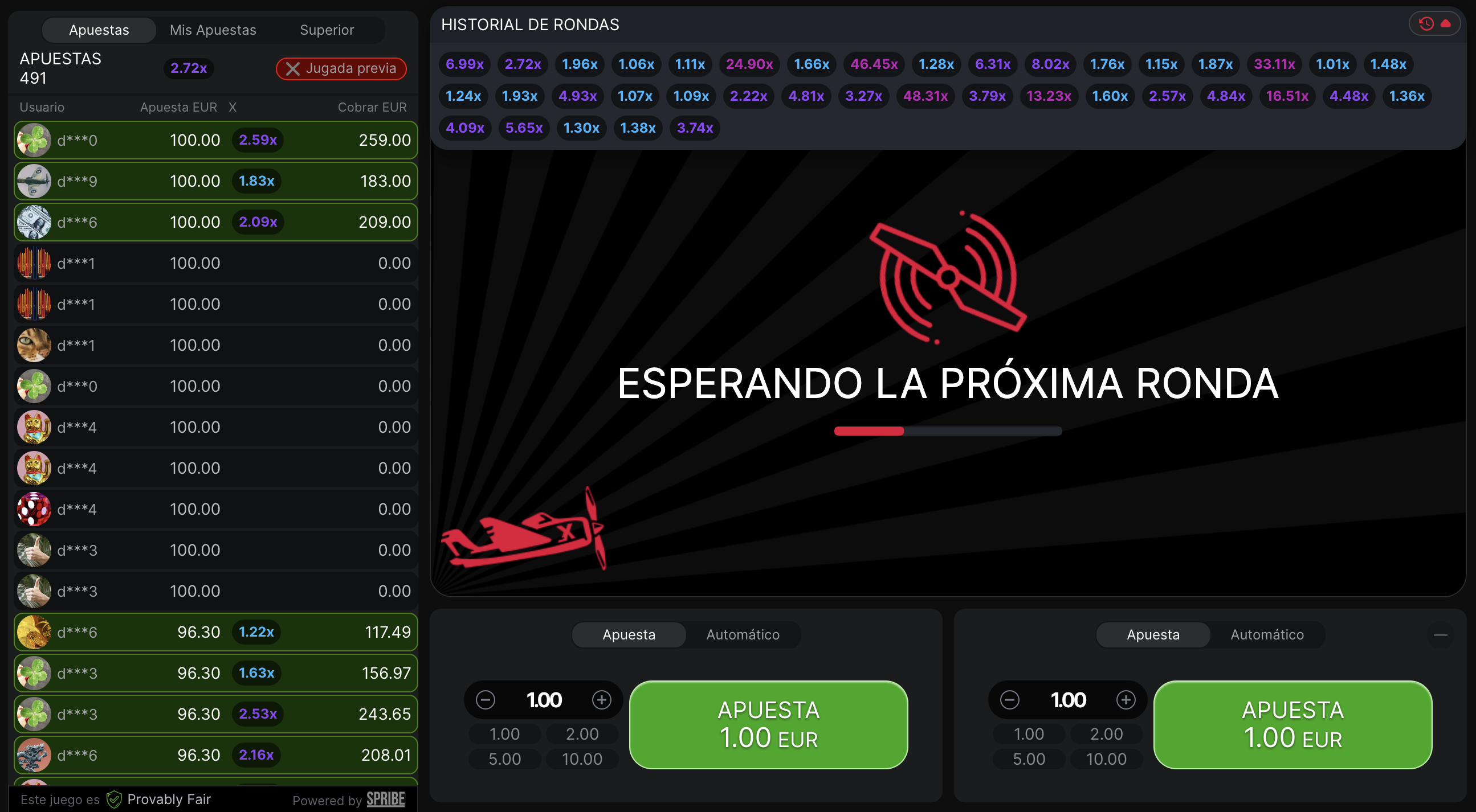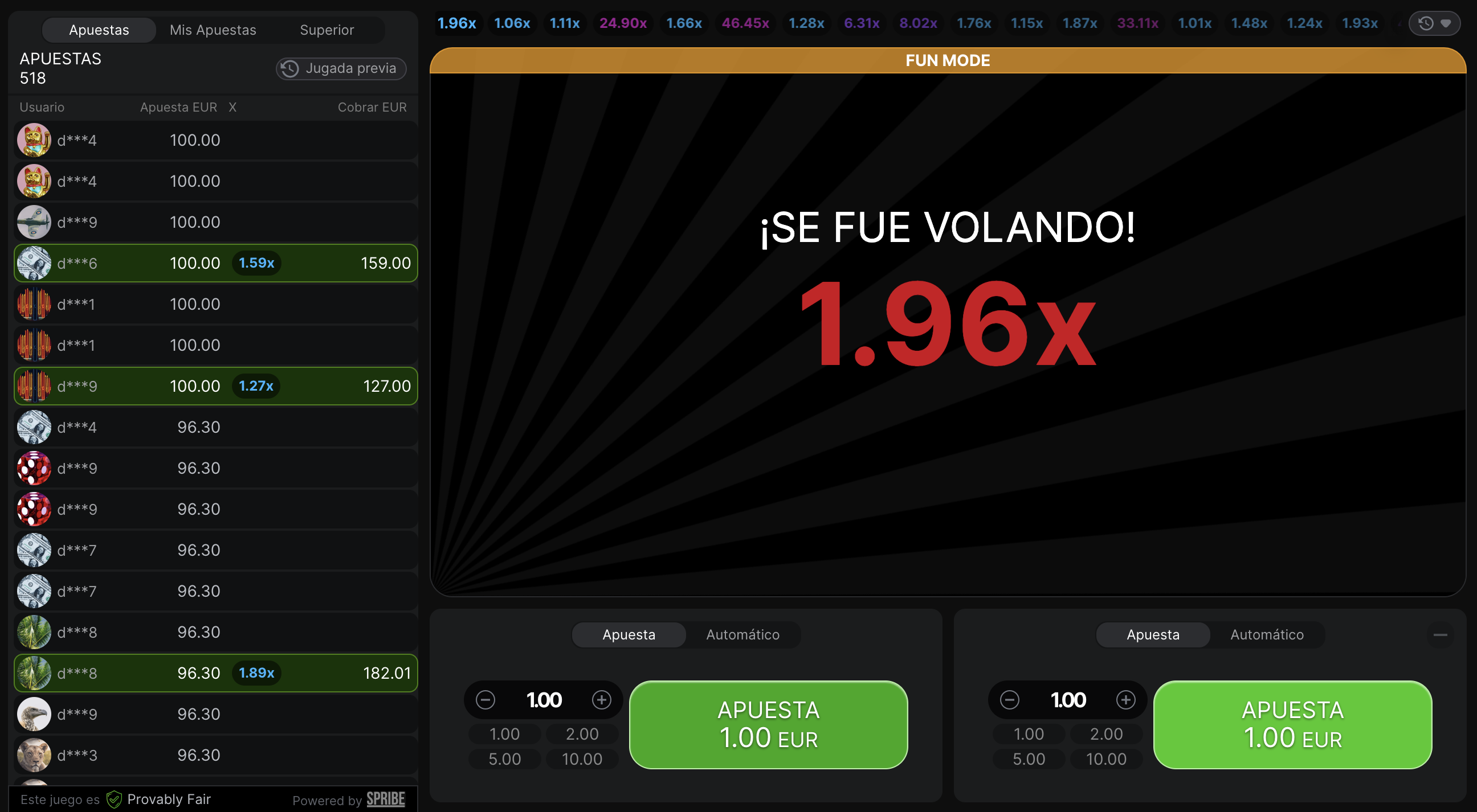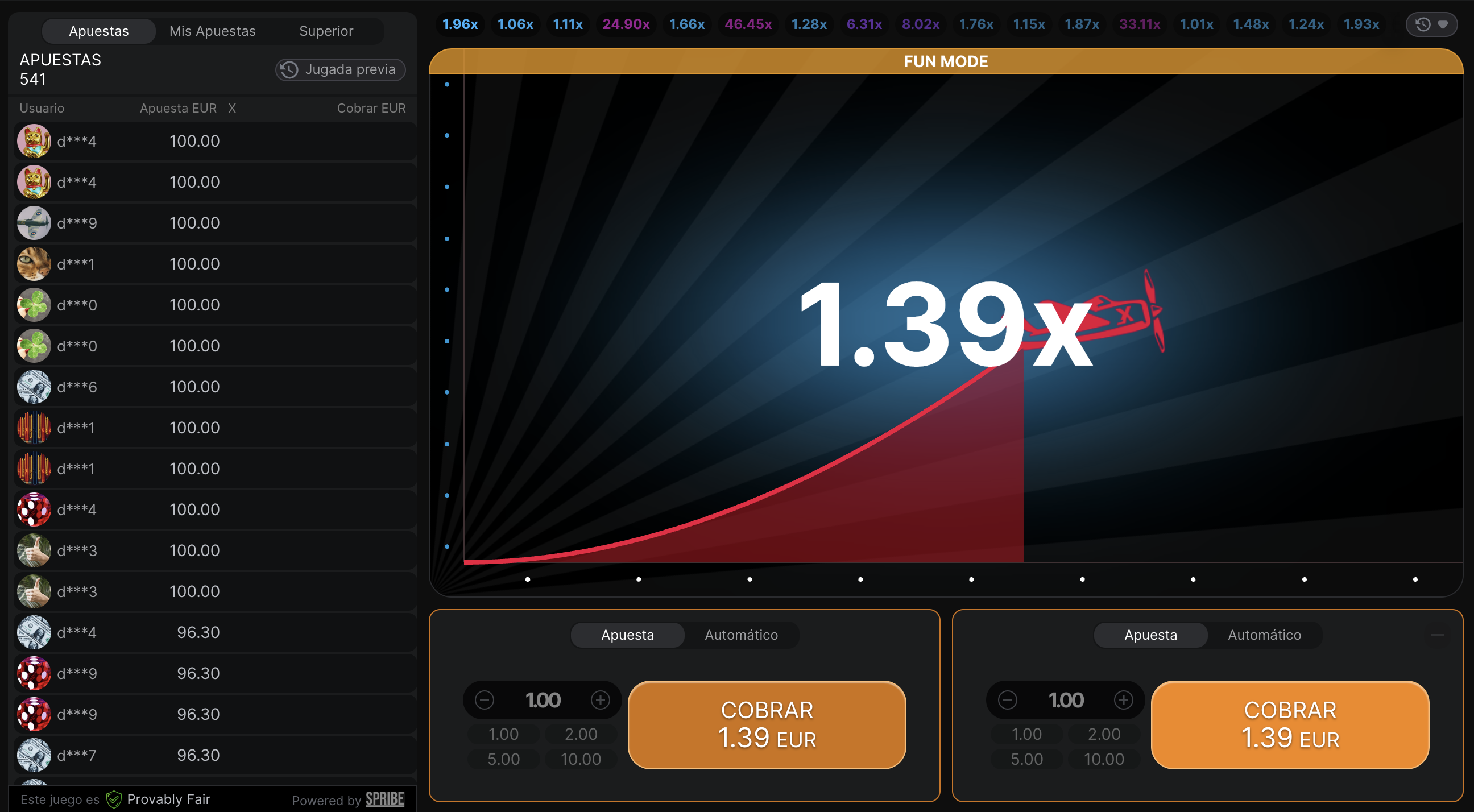 En cada ronda, decides cuánto apostar y en qué momento retirar tu apuesta para obtener un multiplicador. Si no retiras antes de que el avión se estrelle, pierdes todo.